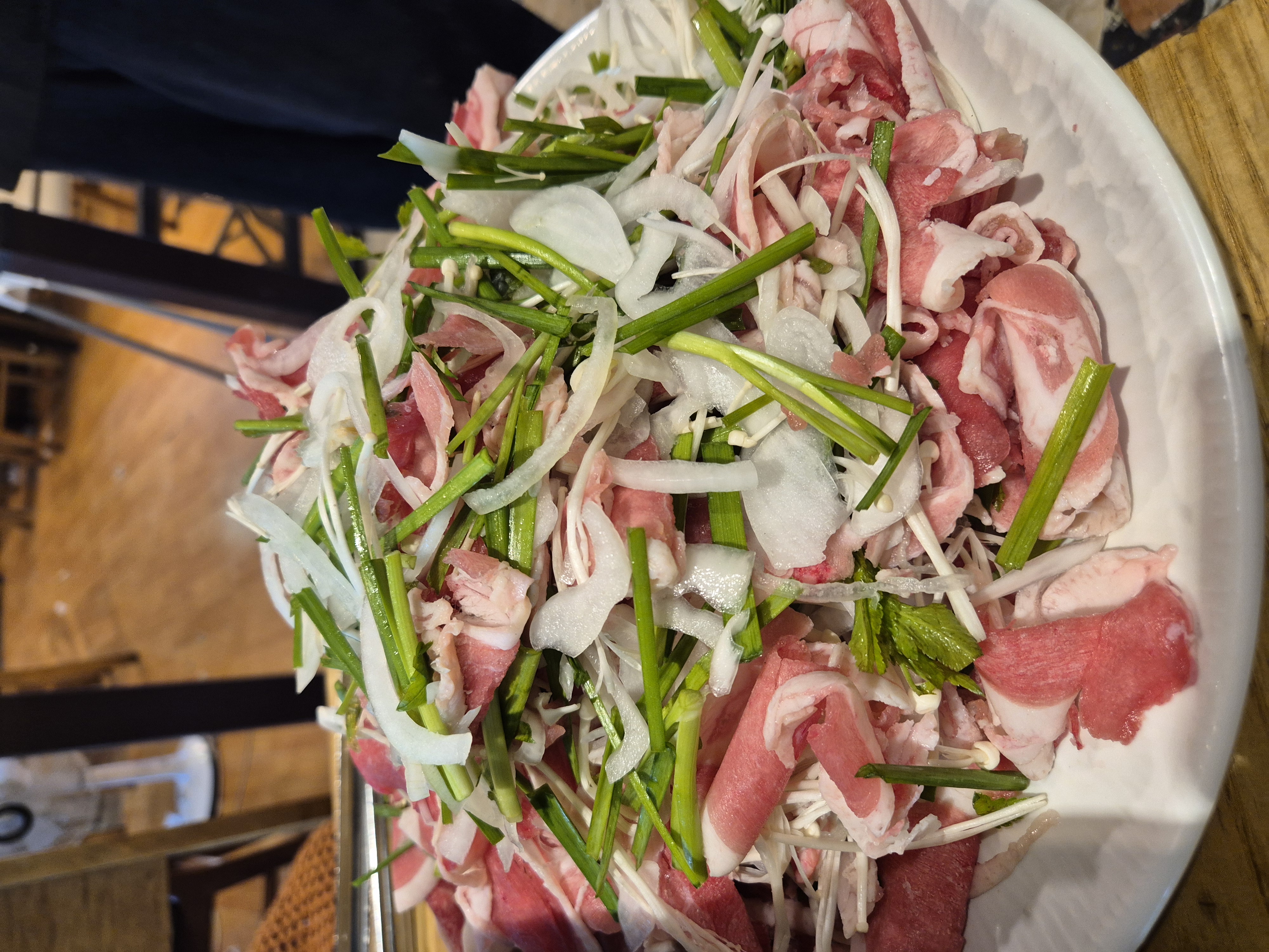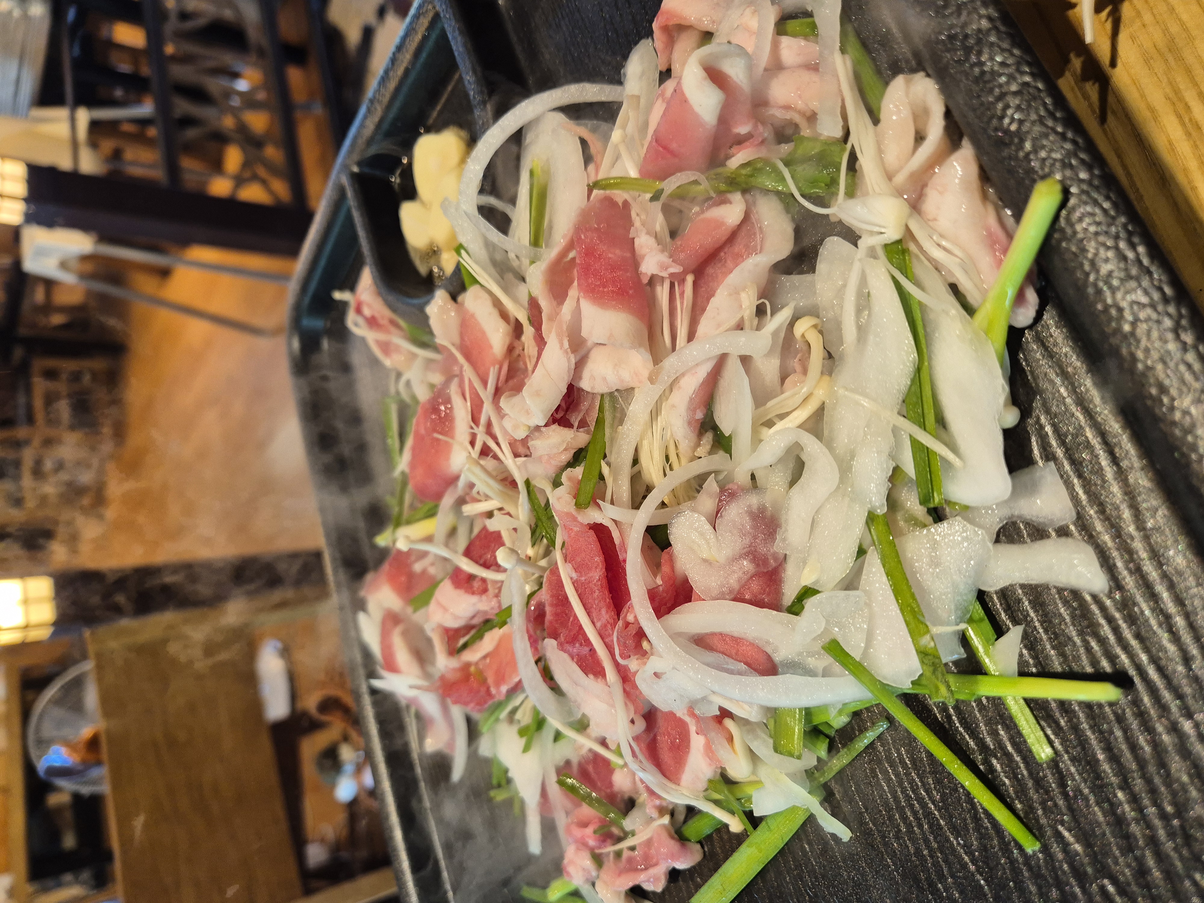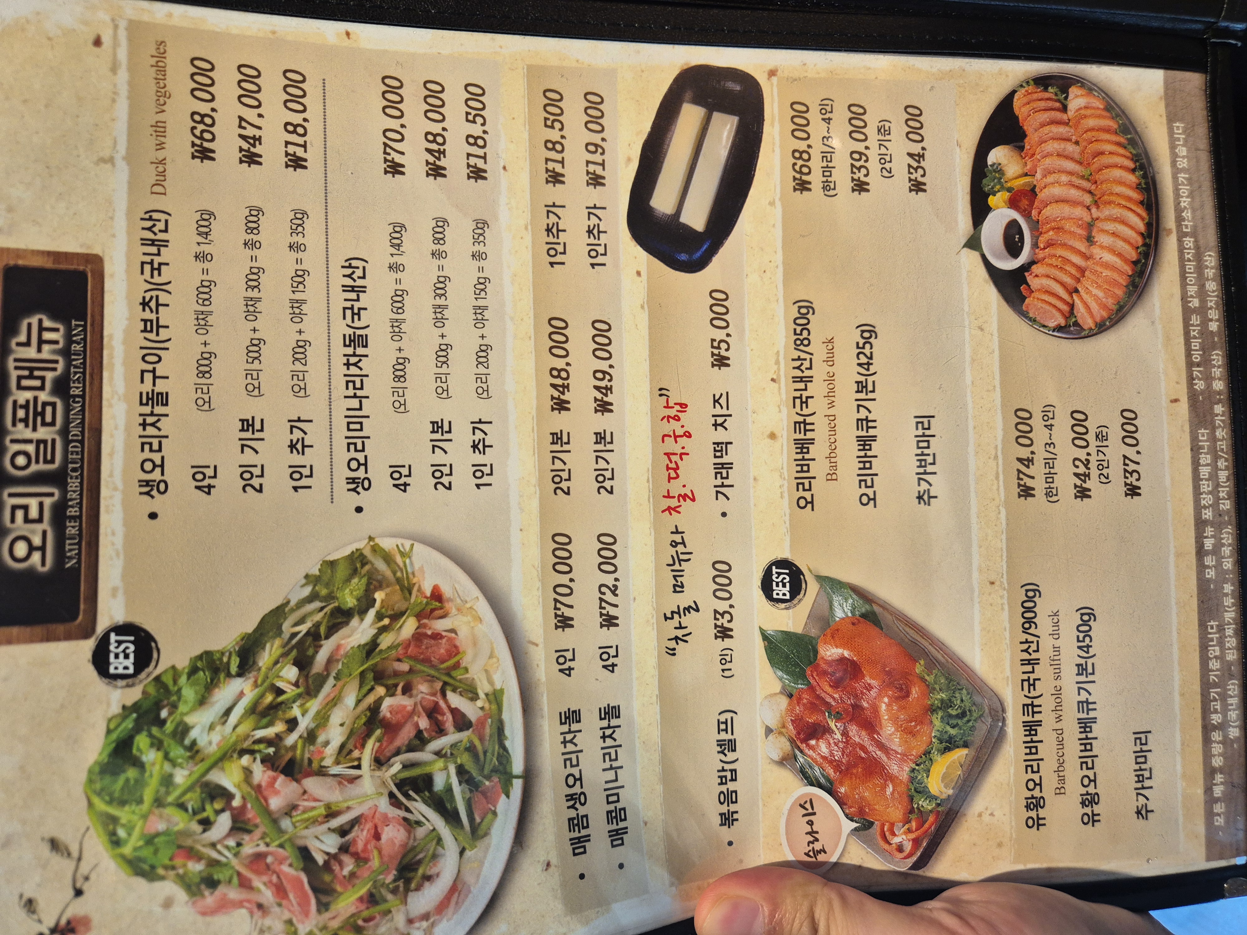 뭐 먹을까 고민하다가 생오리 차돌구이(부추)로 선택