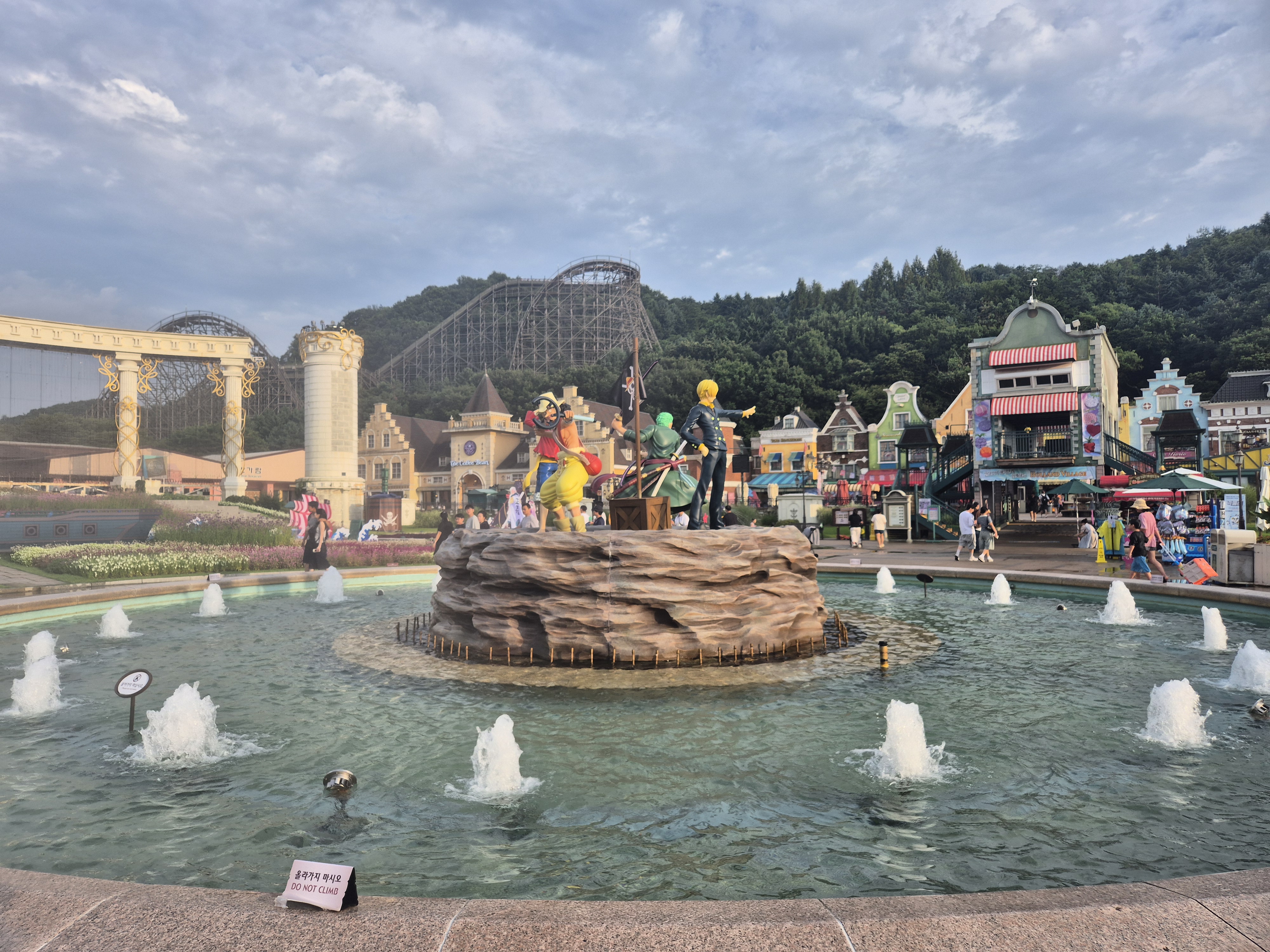 에버랜드 중앙에 넓은 광장 쪽에는 애니메이션 원피스 관련 조형물도 있고 분수와 물놀이할 수 있는 공간들이 있더라고요